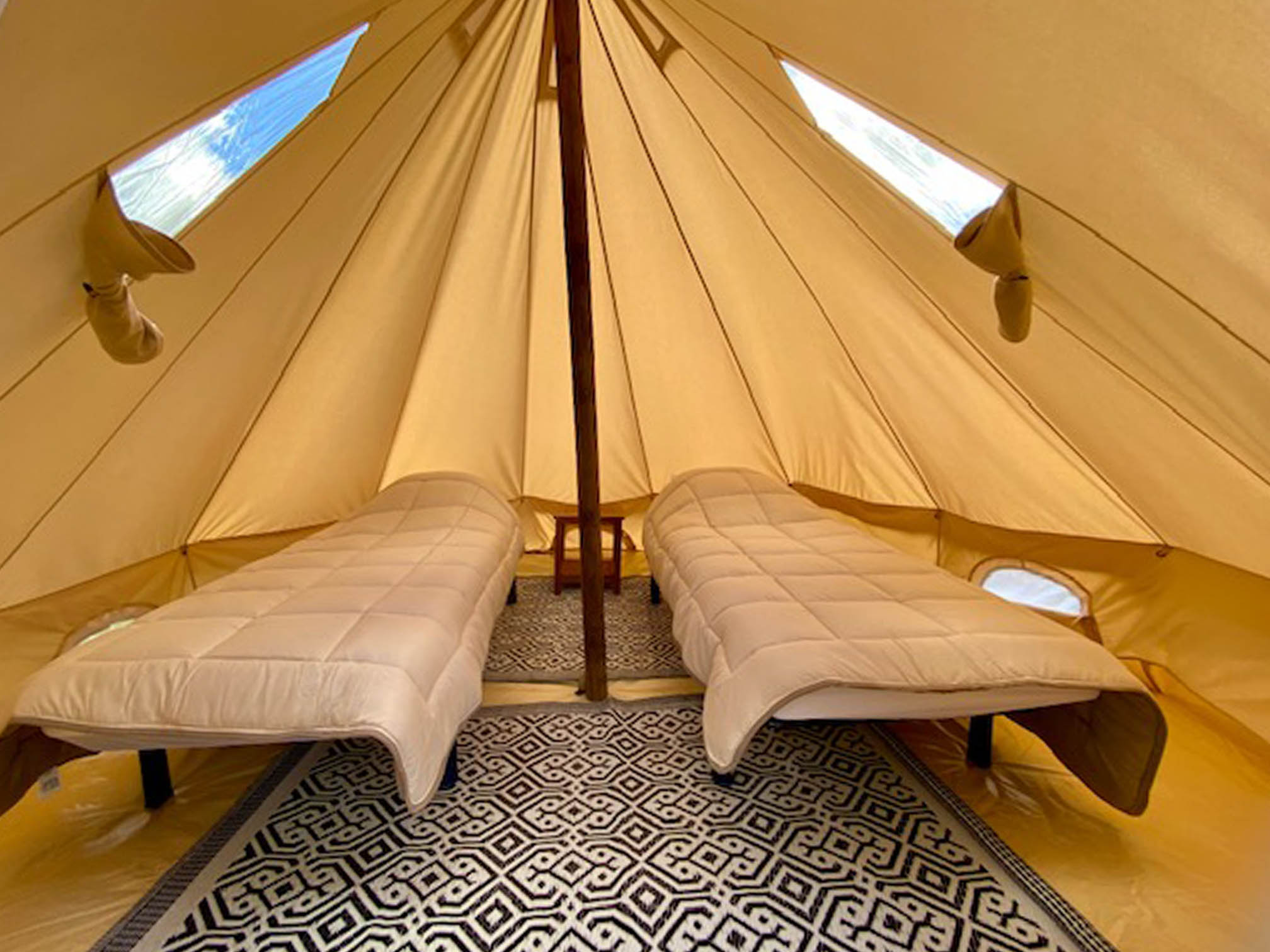 In a quiet area with beautiful sea view, 6 tents equiped with 2 individual beds, duvets and pillows, bedside table, lantern and electricity, are waiting for thoses who want to travel light. Outside, 2 deckchairs and 1 coffee table are available. Remember to bring your own sheets or sleeping bags. Cozy disposable kits are also available at te reception.